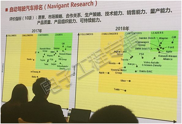 從技術(shù)成熟度上來看,頭部企業(yè)進(jìn)展迅猛,但由此帶來的兩極分化也很明顯,除了那些我們熟悉的大廠,其他都在做分母。產(chǎn)業(yè)化能力上,傳統(tǒng)車企占據(jù)優(yōu)勢,在成波教授曬出的一張圖上,我們看到美國研究咨詢公司Navigant Research對2018年自動(dòng)駕駛企業(yè)做的一個(gè)排名,通用汽車、福特、大眾、寶馬、戴姆勒等傳統(tǒng)車企處于第一梯隊(duì),而Waymo、Aptiv這些技術(shù)性新興企業(yè)也表現(xiàn)搶眼。