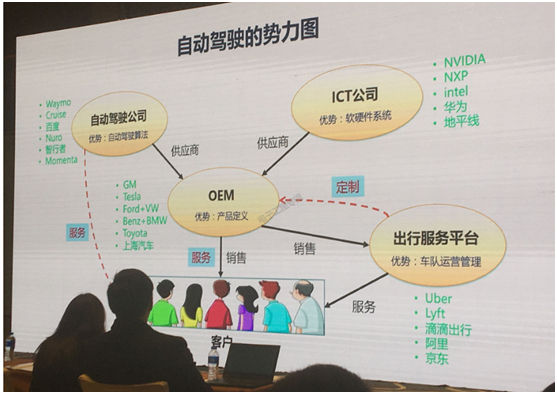 主機(jī)廠處于弱勢,又沒有自動(dòng)駕駛需要相關(guān)的團(tuán)隊(duì)、技術(shù)、市場,怎么辦?組織生態(tài)聯(lián)盟自救,逐漸就形成了上圖的一個(gè)勢力圖。一個(gè)是原來占龍頭地位的主機(jī)廠OEM;一個(gè)是做自動(dòng)駕駛方案的,以Waymo、Cruise、百度、Momenta這些初創(chuàng)公司為代表的;再來是英偉達(dá)、英特爾、華為、地平線這些做ICT,以及博世這類做芯片、操作系統(tǒng)、平臺、架構(gòu)的公司,主導(dǎo)軟硬件系統(tǒng);還有一個(gè)新勢力就是出行平臺,像Uber、滴滴,物流方面阿里和京東也進(jìn)入了。